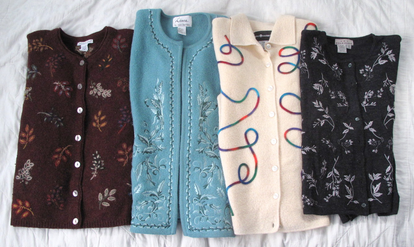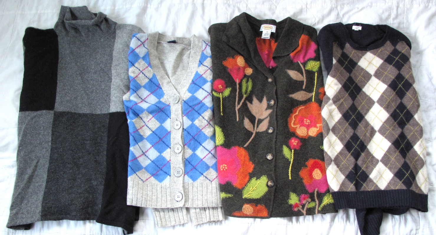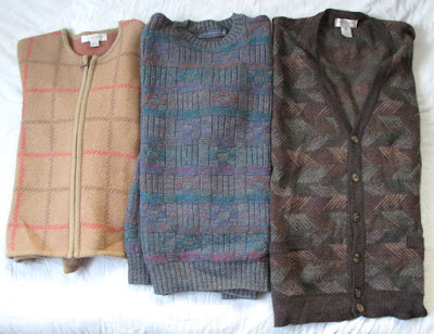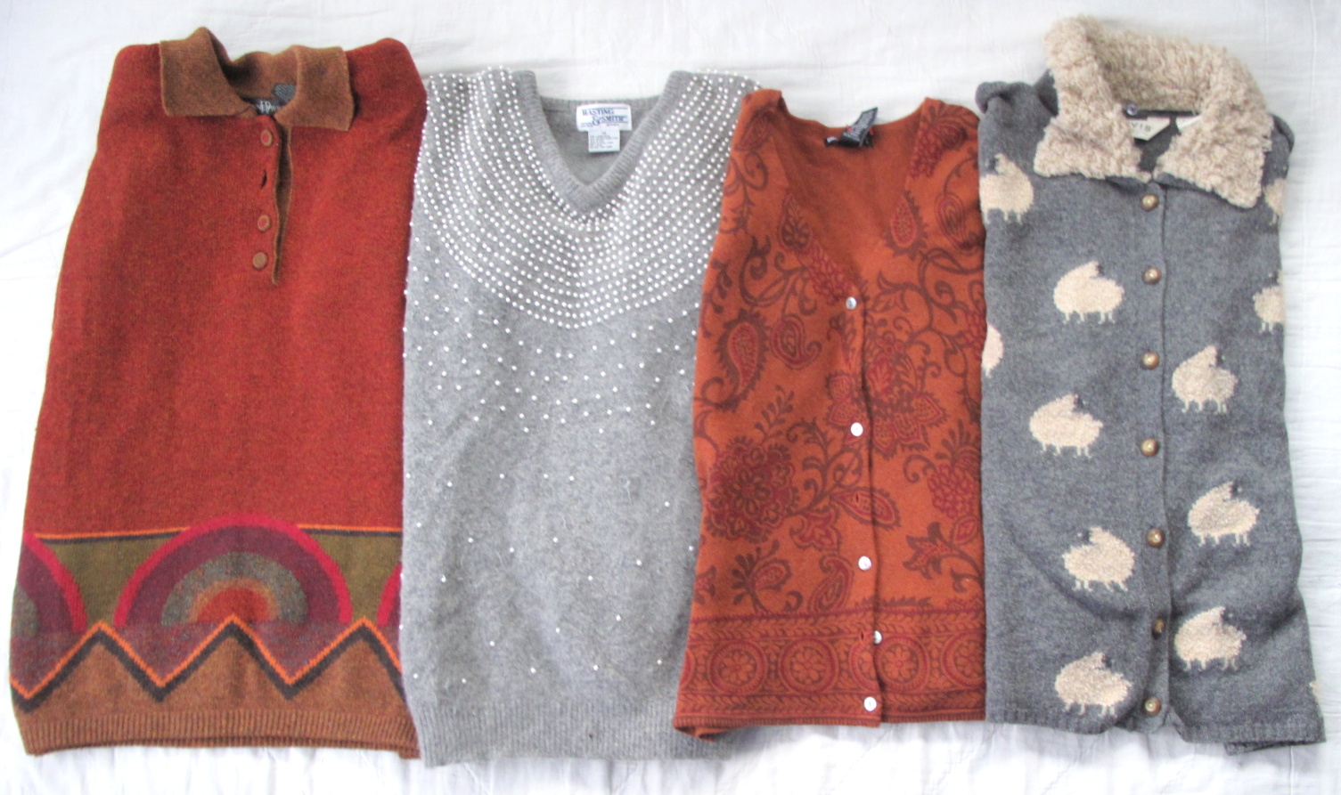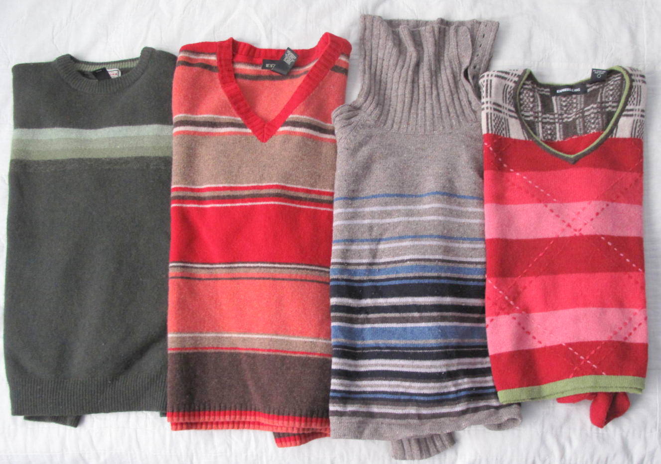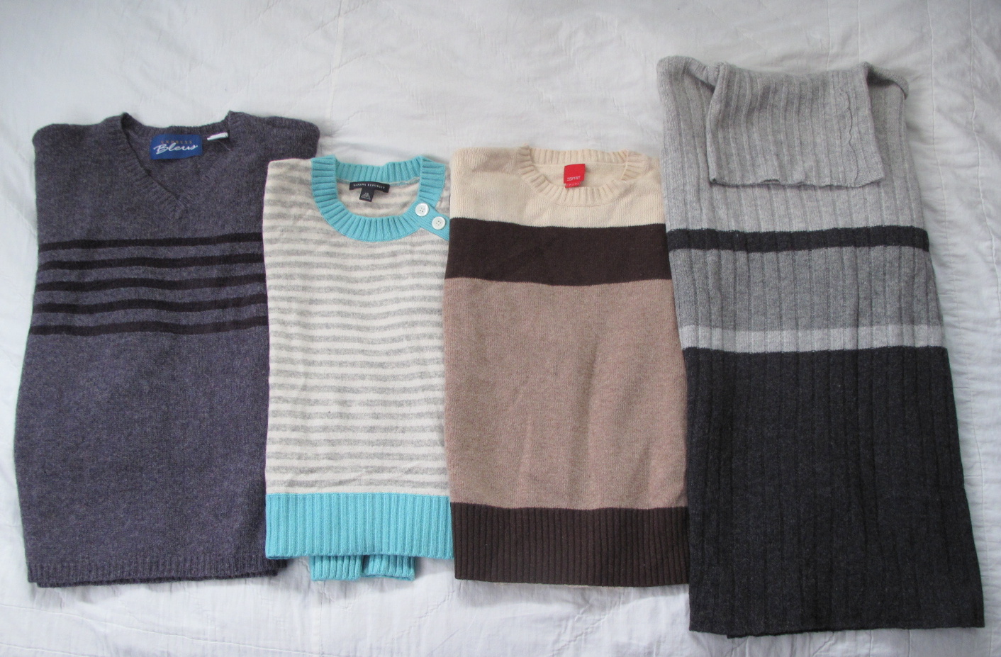 One of the sweaters had perfect cuffs for cozies for my son's water bottle. It is felted, and was the perfect size, so I didn't have to sew a thing, just cut them off and slip them on!